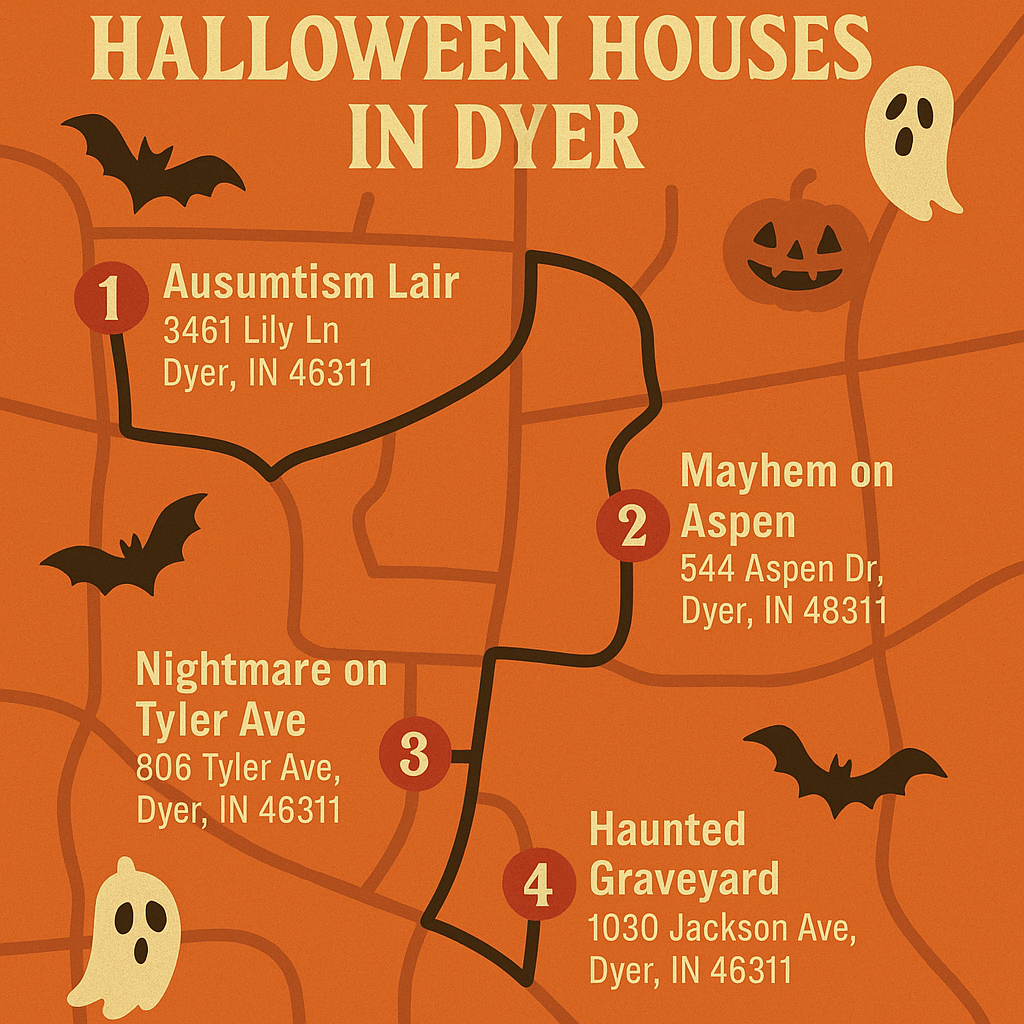 Here are four Halloween Decorated Houses in Dyer, Indiana worth checking out! Just save this image to your phone and enjoy!